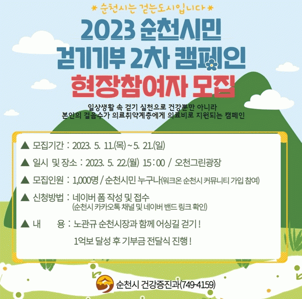 ÀÌ Ä·ÆäÀÎÀº ¸Å¿ù 1ȸ ¼øÃµ½Ã¹Î Âü¿©·Î °Ç° °ÉÀ½¼ö 1¾ï º¸°¡ ´Þ¼ºµÇ¸é ¾ÏȯÀÚ, Èñ±Í³Ä¡¼ºÁúȯÀÚ µî ÀÇ·á Ãë¾à°èÃþ¿¡°Ô ÀÇ·áºñ 2¹é¸¸ ¿øÀÌ ±âºÎµÇ¾î Èûµç ¿ª°æÀ» À̰ܳ»°í »îÀÇ Èñ¸ÁÀÌ µÇ¾î ÁÖ´Â °È±â ½Ã¹Î ¿îµ¿ÀÌ´Ù.
