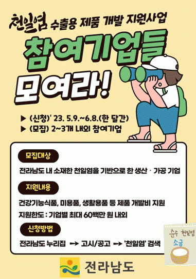¡®ÃµÀÏ¿° ¼öÃâ¿ë Á¦Ç° °³¹ß Áö¿ø»ç¾÷¡¯Àº ¿À´Â 6¿ù 8ÀϱîÁö Á¢¼öÇϸç, ÀÚ¼¼ÇÑ ³»¿ëÀº Àü³²µµ ´©¸®Áý °í½Ã/°ø°í¿¡¼ È®ÀÎÇØ ½ÅûÇÏ¸é µÈ´Ù.