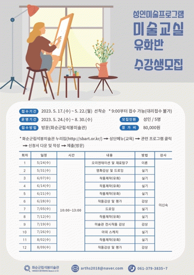 2°Á ¼ö¾÷Àº 5¿ù 24ÀϺÎÅÍ ¸ÅÁÖ ¼ö¿äÀÏ ¿ÀÀü 10½ÃºÎÅÍ ¿ÀÈÄ 1½Ã±îÁö ÃÑ 15ȸÂ÷·Î ¿î¿µµÇ¸ç À¯È±×¸®±â¸¦ ÅëÇØ ±â¹ý°ú »öä¿¡ ´ëÇÑ Å½±¸, ´Ù¾çÇÑ Ç¥Çö ¹æ¹ýÀÇ ½Ç½ÀÀ» ÅëÇÑ ÀÛǰ Á¦ÀÛ ´É·ÂÀ» Çâ»ó½Ãų ¼ö ÀÖ´Â ¹Ì¼ú ±³À° ÇÁ·Î±×·¥ÀÌ´Ù.