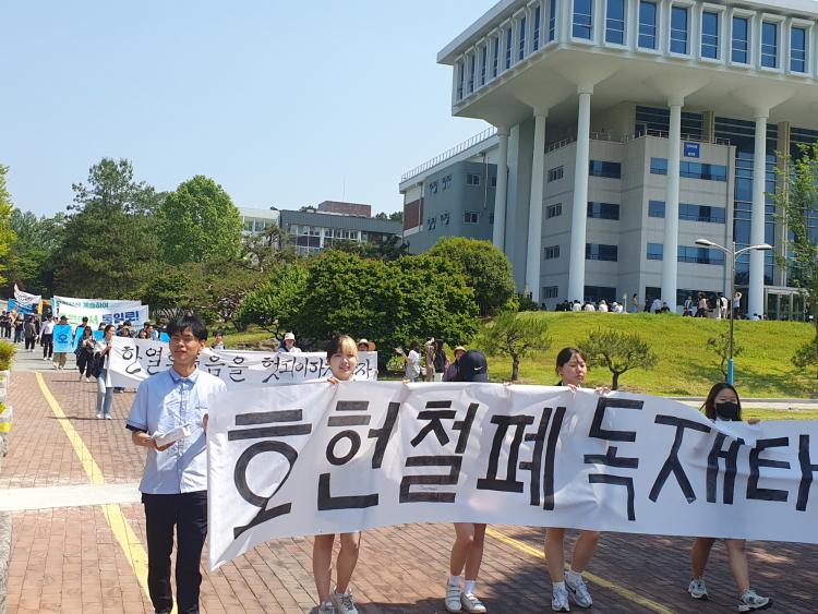 Àü³²´ë 5.18±¤Àå¿¡ Áý°áÇÑ Àü±¹ ´ëÇлý 300¿© ¸íÀº À̳¯ Àü³²´ë Á¤¹®À» °ÅÃÄ ±Ý³²·Î±îÁö 5km ±¸°£À» °¡µÎÇàÁøÇß´Ù. À̵éÀº ¡®5¡¤18ÀÇ Áø»ó±Ô¸í°ú Ã¥ÀÓÀÚ Ã³¹ú¡¯ µîÀ» ¿ÜÄ¡°í, ¡®¹ÎÁֽùΠ¸¸¼¼¡¯, ¡®À¯½ÅÀÜ´ç ¹°·¯°¡¶ó¡¯, ¡®È£ÇåöÆó µ¶À矵µ¡¯, ¡®¿À¿ù¿¡¼ ÅëÀϷΡ¯ µî 1980³â ´ç½Ã¿¡ ³»°É¾ú´ø °¢Á¾ ±¸È£¸¦ ´ãÀº Çö¼ö¸·À» ³»°É¾ú´Ù.