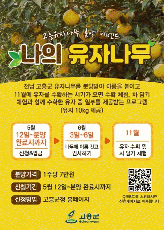 ¡®³ªÀÇ À¯ÀÚ³ª¹«¡¯ À̺¥Æ®´Â µµ½Ã¹ÎÀÌ °íÈï À¯ÀÚ³ª¹«¸¦ ºÐ¾ç¹Þ¾Æ ÀڽŸ¸ÀÇ Æ¯º°ÇÑ À̸§À» À¯ÀÚ³ª¹«¿¡ ºÙÀÎ ÈÄ 11¿ù À¯ÀÚ ¼öÈ®½Ã±â°¡ µÇ¸é Á÷Á¢ À¯ÀÚ¸¦ ¼öÈ®ÇØ Â÷·Î ´ãÀ» ¼ö Àִ üÇè ±âȸ¿Í ¼öÈ®ÇÑ À¯ÀÚ Áß ÀϺÎ(1ÁÖ´ç À¯ÀÚ 10kg)¸¦ Á¦°øÇÏ´Â ¡®µµ³ó °ø°¨Çü¡¯ Ưº° ÇÁ·Î±×·¥ÀÌ´Ù.