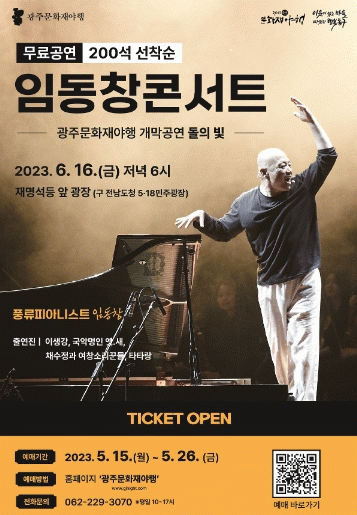 °³¸·°ø¿¬ ¡®µ¹ÀÇ ºû¡¯Àº dz·ù ÇǾƴϽºÆ®·Î ¾Ë·ÁÁø ÀÓµ¿Ã¢ ¾¾¸¦ ÃÊÃ»ÇØ 6¿ù 16ÀÏ ¿ÀÈÄ 6~8½Ã ¿¾ Àü³²µµÃ» ¾Õ¿¡¼ ÁøÇàµÈ´Ù. ¹«Çü¹®ÈÀç(¾Ç±âÀå ÀÌÃáºÀ¡¤È·ù¼Ò¸ñÀå Á¶±âÁ¾)¿Í À¯Çü¹®ÈÀç(Àç¸í¼®µî¡¤±¤ÁÖÀ¾¼ºÀ¯Çã µî)°¡ ǰÀº À̾߱â¿Í ÀÓµ¿Ã¢ÀÇ À½¾Ç ¼¼°è°¡ ¾î¿ì·¯Áö´Â dz·ù ÇѸ¶´çÀ¸·Î ÆîÃÄÁú ¿¹Á¤ÀÌ´Ù.