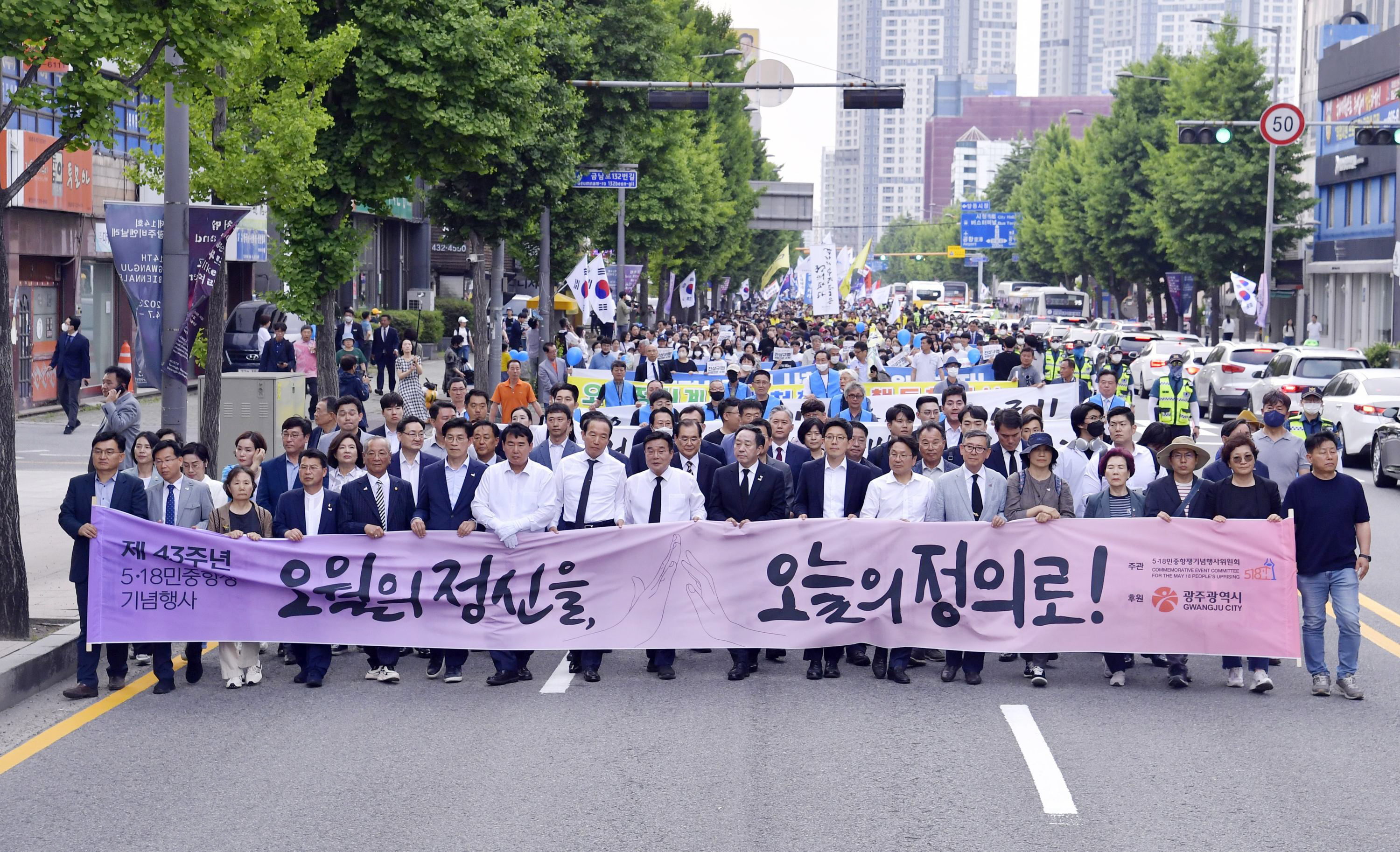 ƯÈ÷ 5¡¤18Àü¾ßÁ¦ Çà»çÀÇ ²ÉÀÎ ¡®¹ÎÁÖÆòÈ´ëÇàÁø¡¯¿¡ Âü°¡ÇÑ ° ½ÃÀå µî °øÁ÷ÀÚµéÀº ¡®5¡¤18Á¤½Å Çå¹ýÀü¹® ¼ö·Ï, ¿øÆ÷ÀÎÆ® °³Çå Ã˱¸¡¯ µî Ç÷¡Ä«µå¿Í ÇÇÄÏ µîÀ» µé°í °Å¸®ÇàÁøÀ» ¹úÀ̸ç, Àηù º¸ÆíÀÇ °¡Ä¡¿Í ÀÌ»ó¿¡ ¸Â´ê¾Æ ÀÖ´Â 5¡¤18Á¤½ÅÀÇ Çå¹ýÀü¹® ¼ö·ÏÀ» °ÇÏ°Ô Ã˱¸Çß´Ù.