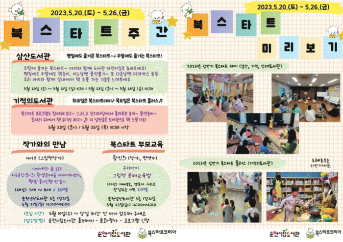 ¼øÃµ½Ã¸³µµ¼°ü¿¡¼´Â »ï»ê, ±âÀû, ½Å´ëµµ¼°ü¿¡¼ ºÏ½ºÅ¸Æ® ÁÖ°£(20~26ÀÏ)À» ¿î¿µÇÏ¸ç °¾ÆÁö¸¦ ÁÖÁ¦·Î ±¸¼ºµÈ ±×¸²Ã¥ Å¥·¹À̼Ç, ¾î¸°ÀÌ½Ç Æ÷ÅäÁ¸, ÇÇÅ©´ÐÁ¸ ¿î¿µ, ¾çÀ°ÀÚ¿Í ¾ÆÀ̰¡ µµ¼°üÀ» ¹æ¹®ÇÏ¿© Ã¥À» ´ëÃâÇÏ¸é °¾ÆÁö ½ºÆ¼Ä¿¸¦ ÁõÁ¤ÇÑ´Ù.