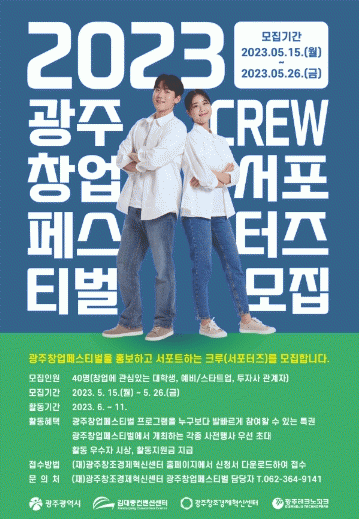 ¾Æ¿ï·¯ 2023 ±¤ÁÖâ¾÷Æä½ºÆ¼¹ú È«º¸´Ü(Å©·ç)Àº â¾÷¿¡ °ü½É ÀÖ´Â ´ëÇлýºÎÅÍ Ã¢¾÷±â¾÷, ÅõÀÚ»ç µî ´©±¸³ª Áö¿øÀÌ °¡´ÉÇÏ¸ç °³ÀÎ »Ó ¾Æ´Ï¶ó ´Üü·Îµµ ½ÅûÀÌ °¡´ÉÇÏ´Ù. È«º¸´Ü(Å©·ç)Àº »çȸ°ü°è¸Á¼ºñ½º(SNS)¿¡ ÀÚÀ¯·Î¿î ¹æ½ÄÀ¸·Î ±¤ÁÖâ¾÷Æä½ºÆ¼¹ú È«º¸ Ȱµ¿À» ÇÏ°Ô µÈ´Ù.