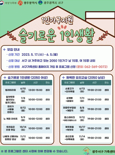 À̸¦ À§ÇØ ¼±¸´Â ½½±â·Î¿î 1ÀλýȰ, ȸñÇÑ ¿ä¸®±³½Ç, 1Àΰ¡±¸ Ä¿¹Â´ÏƼ ÀÚÁ¶¸ðÀÓ ¹× »çȸÀû°ü°è¸Á Çü¼º µî ´Ù¾çÇÑ ºÐ¾ßÀÇ Áö¿ø»ç¾÷ Âü°¡ÀÚ¸¦ ´ÙÀ½´Þ 5ÀϱîÁö ¸ðÁýÇϰí, 10ÀϺÎÅÍ ¿î¿µÇÒ °èȹÀÌ´Ù.