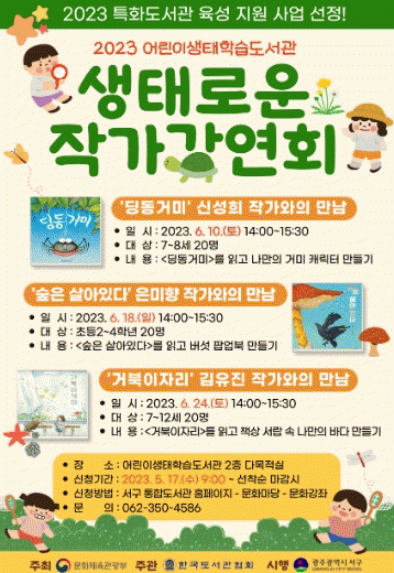 ¼¼ºÎÀÏÁ¤Àº ¡ã7~8¼¼ ´ë»óÀ¸·Î 'µùµ¿°Å¹Ì'¸¦ ÇÔ²² ÀÐ°í ³ª¸¸ÀÇ °Å¹Ì ij¸¯ÅÍ ¸¸µé±â Ȱµ¿À» ÁøÇàÇÏ´Â ½Å¼ºÈñ ÀÛ°¡¿ÍÀÇ ¸¸³²(6.10.) ¡ãÃʵî 2~4Çг⠴ë»óÀ¸·Î '½£Àº »ì¾ÆÀÖ´Ù'¸¦ ÀÐ°í ½£ ¼Ó »ý¸íÀ» ¾Ë¾Æº¸°í ¹ö¼¸ ÆË¾÷ºÏÀ» ¸¸µé¾î º¸´Â Àº¹ÌÇâ ÀÛ°¡¿ÍÀÇ ¸¸³²(6.18.) ¡ã7~12¼¼ ¾î¸°À̵é°ú ÇÔ²² '°ÅºÏÀÌÀÚ¸®'¸¦ Àаí Ã¥»ó ¼¶ø ¼Ó ³ª¸¸ÀÇ ¹Ù´Ù ¸¸µé±â ½Ã°£À» °®´Â ±èÀ¯Áø ÀÛ°¡¿ÍÀÇ ¸¸³²(6.24.)À¸·Î, ¾î¸°ÀÌ»ýÅÂÇнÀµµ¼°ü 2Ãþ ´Ù¸ñÀû½Ç¿¡¼ ¿ÀÈÄ 2½ÃºÎÅÍ 1½Ã°£ 30ºÐ µ¿¾È ÁøÇàµÈ´Ù.
