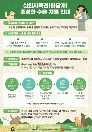 Áö¿ø´ë»óÀº ±¤ÁÖ±¤¿ª½Ã¿¡ ÁÖ¼ÒÁö¸¦ µÎ°í ½Ç°ÅÁÖÇϰí ÀÖ´Â ½Ç¿Ü»çÀ°°ß ¼ÒÀ¯ÀÚ·Î, ÇØ´ç ÀÚÄ¡±¸¿¡ ½ÅûÇÏ¸é µÈ´Ù. ÃÖÁ¾ ¼±Á¤µÇ¸é ÁöÁ¤µÈ µ¿¹°º´¿øÀ¸·Î ¾È³»ÇÑ´Ù.