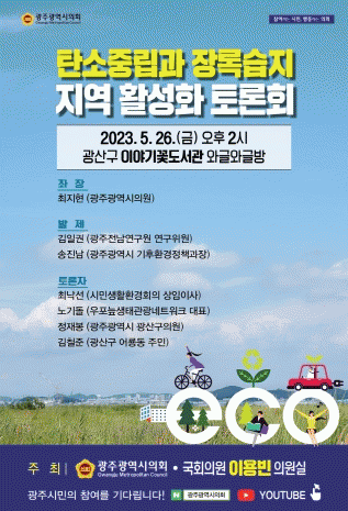 ÃÖÁöÇö ±¤ÁÖ½ÃÀÇ¿øÀÌ ÁÂÀåÀ¸·Î Âü¿©ÇÏ´Â À̳¯ Åä·Ðȸ¿¡´Â ±èÀ챂 ±¤ÁÖÀü³²¿¬±¸¿ø ºÎ¿¬±¸À§¿øÀÌ ¡®Àå·Ï½ÀÁö º¸Àü ¹× °ü¸®¸¦ À§ÇÑ »ýÅÂ°è ¼ºñ½º Ȱ¼ºÈ ¹æ¾È¡¯À» ÁÖÁ¦·Î ¹ßÇ¥ÇÏ°í ±¤ÁÖ±¤¿ª½Ã ±âÈÄȯ°æÁ¤Ã¥°ú ¼ÛÁø³² °úÀåÀÌ ±¤ÁÖ±¤¿ª½Ã¿Í ȯ°æºÎ°¡ °èȹ Áß¿¡ ÀÖ´Â ¡®Àå·Ï½ÀÁö ź¼ÒÈí¼ö¿ø Á¶¼º ÃßÁø »ç¾÷¡¯¿¡ ´ëÇØ ¹ßÇ¥ÇÒ ¿¹Á¤ÀÌ´Ù.