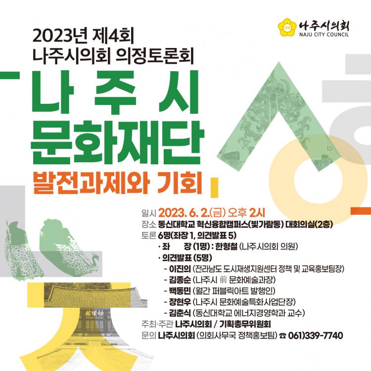 À̹ø Åä·Ðȸ´Â ¡®³ªÁֽà ¹®ÈÀç´ÜÀÇ ¹ßÀü°úÁ¦¿Í ±âȸ¡¯¶ó´Â ÁÖÁ¦·Î, ¹®È¡¤¿¹¼ú¡¤°ü±¤ ºÐ¾ß¿¡ ´ëÇÑ Àü¹®¼ºÀ» ³ôÀ̰í, ½ÇÁúÀûÀÎ ¹®È¡¤¿¹¼ú¡¤°ü±¤ ºÐ¾ß ÁøÈïÀ» À§ÇØ ¼³¸³µÇ´Â '³ªÁֽà ¹®ÈÀç´Ü'ÀÇ °úÁ¦¿Í ±âȸ ¿äÀÎ ºÐ¼® µî Ȱ¼ºÈ ¹æ¾È ¸ð»öÀ» À§ÇØ ¸¶·ÃµÈ ÀÚ¸®´Ù.