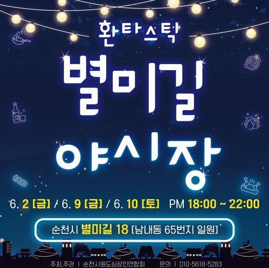 º°¹Ì±æ ¾ß½ÃÀåÀº Áß¾Ó½ÃÀåÀÇ °öâ°ñ¸ñ ÀαÙ(¼øÃµ½Ã º°¹Ì±æ 18)À¸·Î 2ÀÏÀ» ½ÃÀÛÀ¸·Î 9Àϰú 10ÀÏ ¿ÀÈÄ 6½ÃºÎÅÍ 10½Ã±îÁö 3Àϰ£ ½Ã¹ü ¿î¿µÇϸç, Çà»ç À̸§¿¡ °É¸Â°Ô °öâ, ±¹¹ä, ¸¶´ÃÅë´ß µî ¿øµµ½ÉÀÇ º°¹Ì¸¦ Áß½ÉÀ¸·Î ¸Þ´º¸¦ ±¸¼ºÇÏ¿© ¹æ¹®°´µéÀÇ ÀÔ¸ÀÀ» »ç·ÎÀâÀ» ¿¹Á¤ÀÌ´Ù.