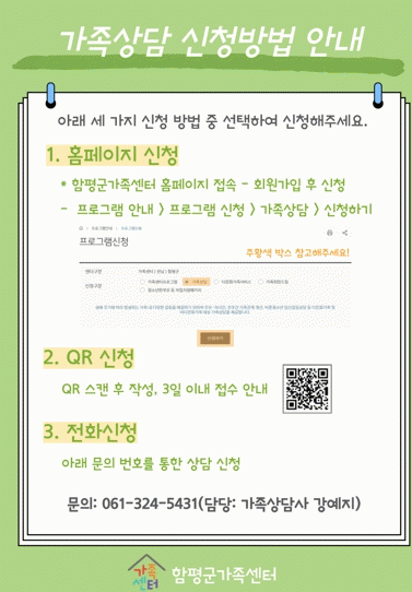 ÇÔÆò±º°¡Á·¼¾ÅÍ¿¡¼´Â °ü³» °¡Á·ÀÇ ¾î·Á¿òÀ» ÁöÇý·Ó°Ô ±Øº¹ÇÏ¿© ±àÁ¤Àû »óÈ£ÀÛ¿ëÀÌ È°¹ßÇÏ°Ô ÀÌ·ç¾îÁú ¼ö ÀÖµµ·Ï Áö¿øÇÏ´Â °¡Á· »ó´ãÀÌ »ó½Ã ¿î¿µµÈ´Ù. °¡Á·»ó´ã ½Åû ¹æ¹ý ¹× °ü·Ã ¹®ÀÇ»çÇ×Àº ÀüÈ(061-324-5430~1) ¹®ÀÇ ¶Ç´Â À§ ¾È³»¹®À» Âü°íÇÏ¸é µÈ´Ù.