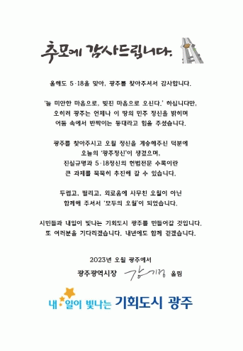 ° ½ÃÀåÀº ¡°¿ÃÇØµµ 5¡¤18À» ¸Â¾Æ ±¤ÁÖ¸¦ ã¾ÆÁÖ°í ÇÔ²²ÇØÁּż °¨»çµå¸°´Ù¡±¸é¼ ¡°¡®´Ã ¹Ì¾ÈÇÑ ¸¶À½À̰í, ºúÁø ¸¶À½ÀÌ´Ù¡¯¶ó°í ÇϽÃÁö¸¸ ¿ÀÈ÷·Á ±¤ÁÖ´Â ¾ðÁ¦³ª ÀÌ ¶¥ÀÇ ¹ÎÁÖ Á¤½ÅÀ» ¹àÈ÷¸ç ¾îµÒ ¼Ó¿¡¼ ¹Ý¦ÀÌ´Â µî´ë¶ó°í ÈûÀ» ÁֽŠ¿©·¯ºÐµéÀÌ Àֱ⿡ ¿Ü·ÓÁö ¾Ê´Ù¡±°í ¸»Çß´Ù.