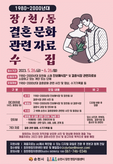 ½Ã´Â 1980³â¿¡¼ 2000³â´ë Àåõµ¿ ¼ÒÀç Áøº¸¿¹½ÄÀå(Àåõµ¿ 15-3)À» ºñ·ÔÇØ ¿¾ ¼øÃµÀÇ °áÈ¥½ÄÀå°ú °ü·ÃµÈ »çÁø°ú ¿µ»ó ÀڷḦ ¸ðÁýÇϸç, ÇØ´ç ÀÚ·áÀÇ ÀúÀÛ±ÇÀ» º¸À¯ÇÑ °³ÀÎ ¹× ´Üü µî ´©±¸µçÁö Âü¿©°¡ °¡´ÉÇÏ´Ù.