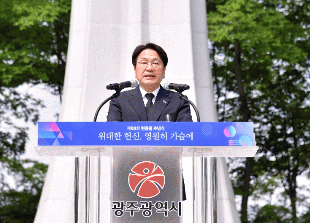 °±âÁ¤ ±¤ÁÖ½ÃÀåÀº ¡°Áö±Ý ¿ì¸®´Â ÀλýÀÇ °¡Àå ºû³ª´Â ½ÃÀýÀ» Á¶±¹¿¡ ¹ÙÄ¡½Å ¼ø±¹¼±¿°ú È£±¹¿µ·ÉÀÇ Èñ»ý°ú Çå½Å À§¿¡ ¼ÀÖ´Ù¡±¸ç ¡°Çå½ÅÀÌ ÀÖ¾ú±â¿¡ ³ª¶ó¸¦ µÇã¾Ò°í, ÀüÀï°ú µ¶ÀçÀÇ ½Ã·ÃÀ» ³¡³»°í Àΰ£Á¸ÁßÀÌ ½ÇÇöµÇ´Â ¹ÎÁÖ°øÈ±¹À» °Ç¼³Çß´Ù¡±°í ¹àÇû´Ù.