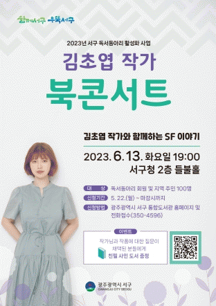À̹ø ºÏ ÄܼƮ´Â ¼±¸ µ¶¼µ¿¾Æ¸® Ȱ¼ºÈ Áö¿ø»ç¾÷ÀÇ ÀÏȯÀ¸·Î ¸¶·ÃµÆ´Ù. ÇãÈñ ¹®ÇÐÆò·Ð°¡°¡ »çȸ¸¦ ¸Ã¾Æ ±è ÀÛ°¡¿Í SF¹®ÇÐ, ÀÛǰ¿¡ ´ëÇØ À̾߱⸦ ³ª´ ¿¹Á¤ÀÌ´Ù. ¶Ç ÇöÀå¿¡¼ µ¶ÀÚµéÀÌ Âü¿©ÇÏ´Â ÁúÀÇÀÀ´äÀ» ÅëÇØ ¼ÒÅëÇÏ´Â ½Ã°£µµ °®´Â´Ù.