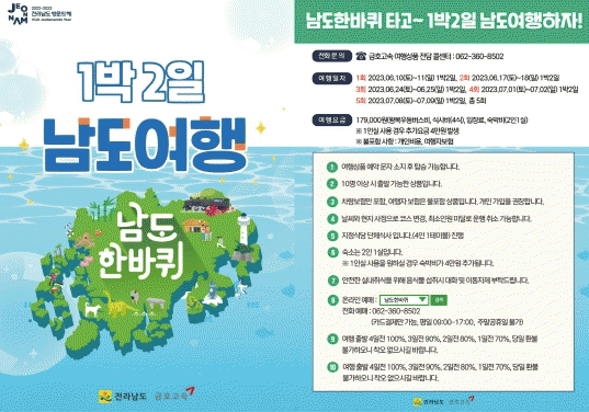 Àü¶ó³²µµ¿¡ µû¸£¸é ³²µµÇѹÙÄû ¡®1¹Ú 2ÀÏ ³²µµ¿©Ç࡯ »óǰÀº ¿À´Â 10ÀϺÎÅÍ 4ÁÖ°£ ¸ÅÁÖ Å䡤ÀÏ¿äÀÏ ÃÑ 4ȸ ¿î¿µµÈ´Ù. ÀÌ¿ë ¿ä±ÝÀº 1ÀÎ 17¸¸ 9õ ¿øÀ¸·Î ¿Õº¹¹ö½ººñ, ½Ä»çºñ 4½Ä, ¼÷¹Úºñ(2ÀÎ 1½Ç) µîÀÌ Æ÷ÇԵƴÙ. ¿¹¸Å´Â ³²µµÇѹÙÄû ´©¸®Áý ¶Ç´Â ÀüÈ·Î ÇÏ¸é µÈ´Ù.