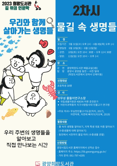 2Â÷ ÇÁ·Î±×·¥Àº ¿À´Â 10Àϰú 11ÀÏ¿¡ ¼º¹«¼º ¹°µéÀÌ¿¬±¸¼ÒÀå°ú ÇÔ²² ±¤¾çÀ¾ µ¿Ãµ°ú ¼ÃµÀ» ¹æ¹®ÇØ ±¤¾çÀÇ ´ëÇ¥ ¾îÁ¾À» ¾Ë¾Æº¸°í ¼ö»ý»ý¹°À» °üÂûÇÏ´Â ¡®¹°±æ ¼Ó »ý¸íµé¡¯ÀÌ °èȹµÅ ÀÖ´Ù.