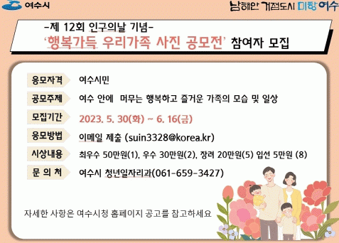 À̹ø °ø¸ðÀüÀº 7¿ù 11ÀÏ ¼¼°è Àα¸ÀÇ ³¯À» ¸Â¾Æ Àα¸¹®Á¦ ±Øº¹¿¡ ´ëÇÑ ¹ü½Ã¹Î µ¿Âü ¹× °¡Á·Ä£ÈÀû ºÐÀ§±â¸¦ Á¶¼ºÄÚÀÚ ¸¶·ÃµÆ´Ù.
