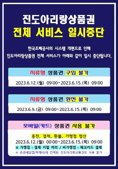 »óǰ±Ç »ç¿ë ÀϽà Áß´ÜÀº Çѱ¹Á¶Æó°ø»çÀÇ Áö¿ª»ç¶û»óǰ±Ç chak ½Ã½ºÅÛ °³Æí ÀÛ¾÷¿¡ µû¸¥ °ÍÀ¸·Î Àü±¹ 90°³ Áö¹æÀÚÄ¡´ÜüÀÇ Áö¿ª»ç¶û»óǰ±Ç ¼ºñ½º ÀÌ¿ëÀÌ µ¿½Ã¿¡ ÀϽà ÁߴܵȴÙ.