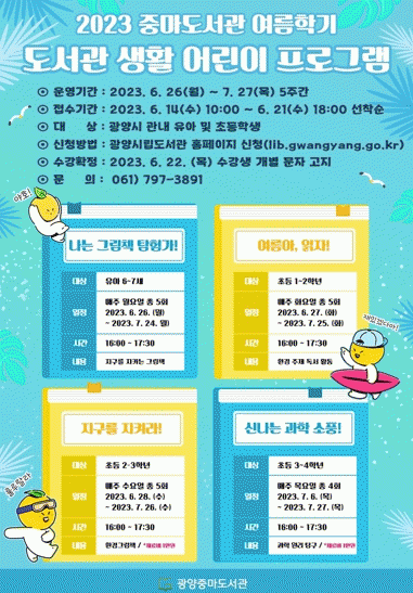 2023 ¿©¸§Çб⠵µ¼°ü »ýȰ ¾î¸°ÀÌ ÇÁ·Î±×·¥ ¼ö° ½Åû µî ±âŸ ±Ã±ÝÇÑ »çÇ×Àº ±¤¾ç½Ã¸³µµ¼°ü ´©¸®ÁýÀ» Âü°íÇϰųª Á߸¶µµ¼°üÀ¸·Î ¹®ÀÇÇϸé ÀÚ¼¼È÷ ¾Ë ¼ö ÀÖ´Ù.