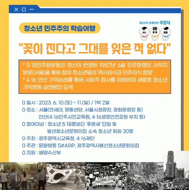 ¡®Ã»¼Ò³â ¹ÎÁÖÁÖÀÇ ÇнÀ¿©Ç࡯Àº ±¤ÁÖ±¤¿ª½Ã±³À°Ã»°ú 4¡¤16Àç´ÜÀÌ ÁÖÃÖÇÏ°í ¹®ÈÇൿ S#ARP°ú ºÀ¼±Ã»¼Ò³â¹®ÈÀÇÁýÀÌ ÁÖ°ü, ÇØ¾ç¼ö»êºÎÀÇ Áö¿øÀ¸·Î ÁøÇàÇÑ´Ù.