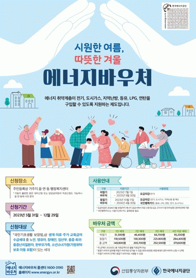 2023³â ¿¡³ÊÁö¹Ù¿ìó Áö¿ø ±Ý¾×Àº ¼¼´ë¿ø ¼ö¿¡ µû¶ó ÃÖ¼Ò 149,800¿ø(1ÀÎ)ºÎÅÍ 379,600¿ø(4ÀÎ ÀÌ»ó)±îÁö Áö¿øµÈ´Ù. ÇÏÀý±â ¹Ù¿ìó´Â 7¿ù 1ÀϺÎÅÍ 9¿ù 30ÀϱîÁö, µ¿Àý±â ¹Ù¿ìó´Â 10¿ù 11ÀϺÎÅÍ ³»³â 4¿ù 30ÀϱîÁö »ç¿ëÇÒ ¼ö ÀÖ´Ù.