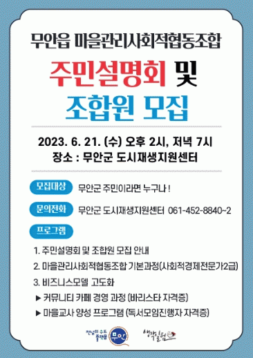 Áö³ 2¿ù¿¡ ±¹Åä±³ÅëºÎ·ÎºÎÅÍ Àΰ¡¹ÞÀº ¹«¾È±º µµ½ÃÀç»ý ¸¶À»°ü¸®»çȸÀûÇùµ¿Á¶ÇÕ(ÀÌ»çÀå ±èµµÇü)ÀÇ º»°ÝÀûÀÎ ¿î¿µÀ» À§ÇÏ¿© Áֹμ³¸íȸ¸¦ ÅëÇØ ½Ç¹«¿ª·® °È ¿î¿µ °úÁ¤À» ¼Ò°³Çϰí ÇâÈÄ »ç¾÷¿¡ Á÷Á¢ Âü¿©ÇÒ Á¶ÇÕ¿øÀ» ¸ðÁýÇÏ°Ô µÈ´Ù.