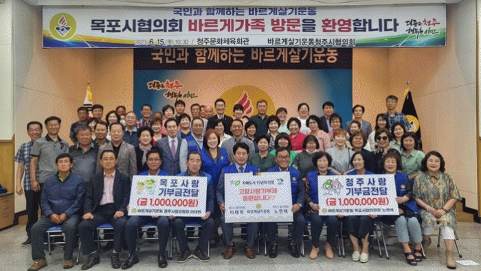À̳¯ ¸ñÆ÷½Ã ¹Ù¸£°Ô»ì±â¿îµ¿ÇùÀÇȸ¿Í ûÁֽà ¹Ù¸£°Ô»ì±â¿îµ¿ÇùÀÇȸ ȸ¿ø 50¿©¸íÀº ûÁÖ¹®ÈüÀ°È¸°ü¿¡ ¸ð¿© ±³·ù½ÄÀ» ÇÔ²² ÇßÀ¸¸ç, º¸´Ù ¶æ±íÀº ¿ìÀǸ¦ ´ÙÁö°íÀÚ ¾ç ÇùÀÇȸ ȸÀå°£ °íÇâ»ç¶û±âºÎ±Ý 100¸¸¿øÀ» »óÈ£ ±âŹÇß´Ù.