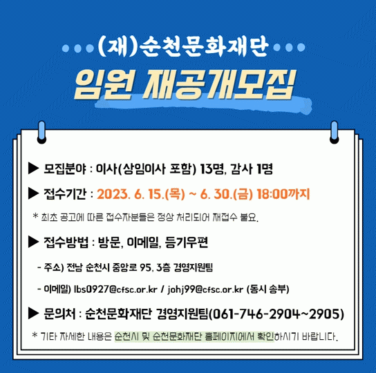 Á¢¼ö¹æ¹ýÀº ÃÖÃÊ °ø°í¿Í µ¿ÀÏÇÏ°Ô ¹æ¹®, ÀüÀÚ¿ìÆí, µî±â¿ìÆíÀ¸·Î Á¢¼ö°¡ °¡´ÉÇϸç, ¿À´Â 30ÀÏ 18½Ã±îÁö µµÂøºÐ¿¡ ÇÑÇÑ´Ù. À̹ø Àç°ø°³¸ðÁý°ú °ü·ÃÇÑ ÀÚ¼¼ÇÑ ³»¿ëÀº ¼øÃµ½Ã ´©¸®Áý ¶Ç´Â ¼øÃµ¹®ÈÀç´Ü ´©¸®Áý °ø°í¹®À» ÅëÇØ È®ÀÎÇÒ ¼ö ÀÖ´Ù.