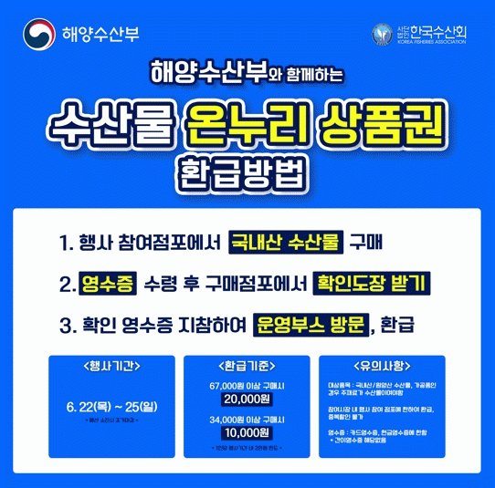 Çà»ç´Â ¿À´Â 22ÀϺÎÅÍ 25ÀϱîÁö ÁøÇàµÇ¸ç, ¼ö»ê¹° ÆÇ¸ÅÁ¡Æ÷¿¡¼ ±¹³»»ê ¼ö»ê¹°À» ±¸ÀÔÇÏ¸é ½ÃÀå ³» ȯ±Þ ºÎ½º¿¡¼ ¿µ¼öÁõÀ» È®ÀÎÇÏ°í ´çÀÏ ±¸¸Å±Ý¾×ÀÇ ÃÖ´ë 30%¸¦(ÃÖ´ë 2¸¸¿ø) ¿Â´©¸®»óǰ±ÇÀ¸·Î ȯ±ÞÇØÁÖ´Â ¹æ½ÄÀ¸·Î ÁøÇàµÈ´Ù.