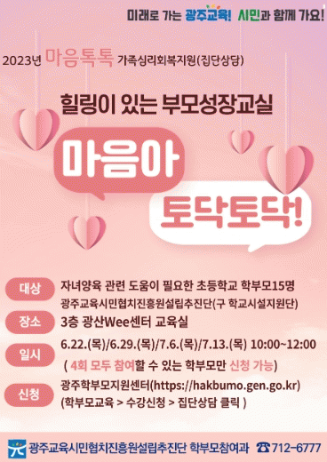 ±¤ÁÖ±³À°½Ã¹ÎÇùÄ¡ÁøÈï¿ø¼³¸³ÃßÁø´Ü ±èÁø±¸ ´ÜÀåÀº ¡°¡®¸¶À½ ÅåÅ塯 °¡Á·½É¸®È¸º¹Áö¿øÀ¸·Î ÇкθðÀÇ ÀÚ³à¾çÀ° °úÁ¤ Áß ¹ß»ýÇÏ´Â ¹®Á¦¿¡ ´ëÇÑ ÇØ°á ¹æ¾È Á¦½Ã¿Í ¿¹¹æ È¿°ú¸¦ ±â´ëÇÑ´Ù¡±¸ç ¡°°¡Á¤ ³» °¥µîÀÌ ÀÖ´Â ÇкθðµéÀÌ À̹ø °¡Á·½É¸®È¸º¹Áö¿ø ÇÁ·Î±×·¥¿¡ Àû±Ø Âü¿©ÇØ ÇູÇÑ °¡Á·°ü°è°¡ Çü¼ºµÆÀ¸¸é ÁÁ°Ú´Ù"°í ¹àÇû´Ù.