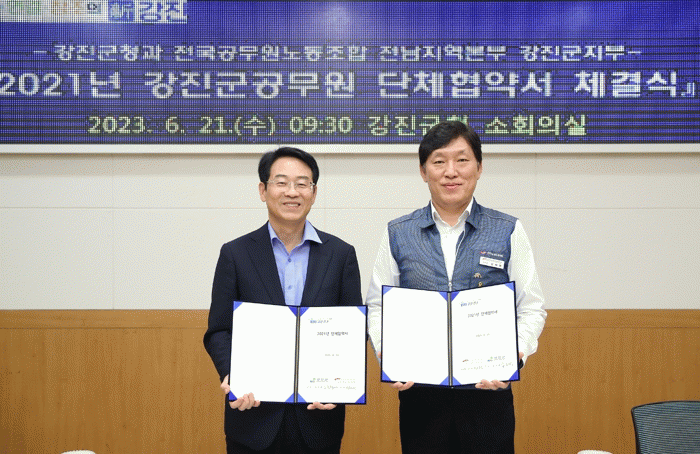 À̳¯ Çù¾à½Ä¿¡´Â °Áø¿ø ±º¼ö¿Í Àü°ø³ë °Áø±ºÁöºÎ ±èÀç¸í ÁöºÎÀåÀ» ºñ·ÔÇØ, ¾çÃø ±³¼·À§¿ø 12¸íÀÌ Âü¼®Çß°í, ¡ã±Ù¹«È¯°æ °³¼± ¡ã°ø¹«¿ø ó¿ì Çâ»ó ¡ãÁ÷¿ø°£ ¼ÒÅë °È¸¦ °ñÀÚ·Î ÃÖÁ¾ ÇÕÀǸ¦ µµÃâÇß´Ù. À̹ø Çù¾àÀº Áö³ 2018³â ´ÜüÇù¾à ü°á(2019. 11. 6.) ÀÌÈÄ 3³â ¸¸¿¡ ÇÕÀÇÇÑ °ÍÀ¸·Î, ¾ÕÀ¸·Î 3³â°£ È¿·ÂÀ» À¯ÁöÇÑ´Ù.