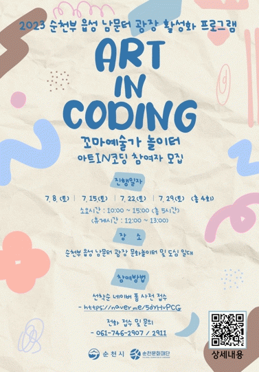 ³²¹®ÅÍ ±¤Àå ¾î¸°ÀÌ ¹®È¿¹¼úÇÁ·Î±×·¥ ¡®¾ÆÆ®INÄÚµù¡¯Àº 7¿ù 8ÀϺÎÅÍ 7¿ù 27ÀϱîÁö ¸ÅÁÖ Åä¿äÀÏ ¿ÀÀü 10½ÃºÎÅÍ ¿ÀÈÄ 2½Ã¿¡ ¼øÃµºÎ À¾¼º ³²¹®ÅÍ ±¤Àå ¹®È³îÀÌÅÍ¿¡¼ ÁøÇàµÇ¸ç, Âü°¡ºñ´Â ¹«·áÀÌ´Ù. ³×À̹ö Æû°ú Àüȸ¦ ÅëÇØ Á¢¼öÇÏ¸ç ¼±Âø¼øÀ¸·Î 8¸íÀ» ¸ðÁýÇÑ´Ù.