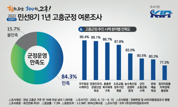 ¹Î¼±8±â °íÈﱺÀÌ ±ºÁ¤ ¿î¿µÀ» ÀßÇÏ´ÂÁö¿¡ ´ëÇÑ Áú¹®¿¡ ¡®ÀßÇϰí ÀÖ´Ù¡¯´Â ±àÁ¤ Æò°¡´Â 84.3%·Î ³ôÀº ¸¸Á·µµ¸¦ ³ªÅ¸³½ ¹Ý¸é, ¡®Àß ¸øÇϰí ÀÖ´Ù¡¯¶ó´Â ºÎÁ¤ Æò°¡´Â 15.7%¿¡ ±×ÃÆ´Ù.
