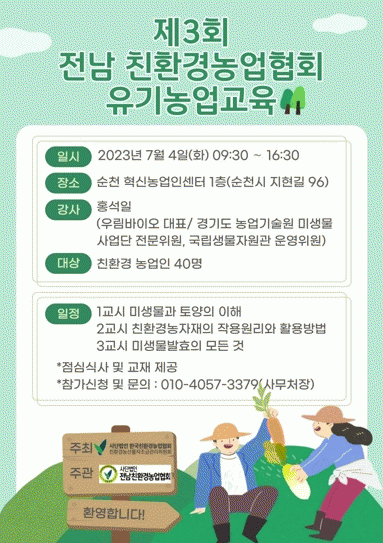 ģȯ°æ³ó¾÷ÀÎÀ» ´ë»óÀ¸·Î 4ÀÏ ¼øÃµ Çõ½Å³ó¾÷¼¾ÅÍ¿¡¼ °³ÃÖÇÏ´Â 1ȸÂ÷ ±³À°Àº ¹Ì»ý¹° Àü°ø ¹Ú»çÀÎ È«¼®ÀÏ ¿µ±¤ ¿ì¸²¹ÙÀÌ¿À(ÁÖ) ´ëÇ¥°¡ ¡®¹Ì»ý¹°ÀÇ ÀÌÇØ¿Í À¯±â³ó¾÷ Åä¾ç°ü¸®¡¯¸¦ ÁÖÁ¦·Î °ÀÇÇÑ´Ù. ¹Ì»ý¹°°ú Åä¾çÀÇ ÀÌÇØ, ģȯ°æ ³óÀÚÀçÀÇ ÀÛ¿ë ¿ø¸®¿Í Ȱ¿ë ¹æ¹ý, ¹Ì»ý¹° ¹ßÈ¿ÀÇ ¸ðµç °Í µî¿¡ ´ëÇÑ °ÀÇ¿Í ÄÁ¼³ÆÃÀ» ÇÑ´Ù.