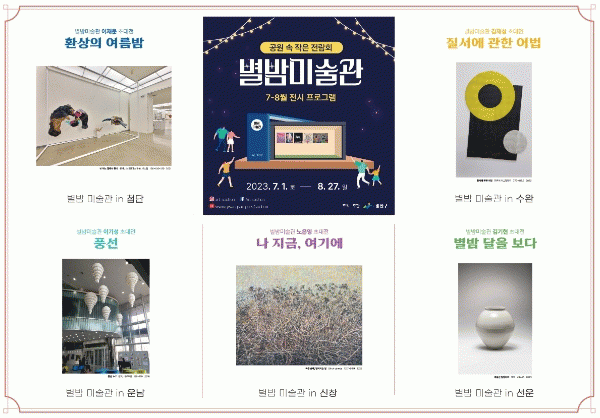 ¡®º°¹ã¹Ì¼ú°ü¡¯Àº µµ½É ¼Ó °ø¿ø 5°³¼Ò(½Ö¾Ï°ø¿ø, dz¿µÁ¤Ãµº¯±æ°ø¿ø, ¿î³²±Ù¸°°ø¿ø, ½Å⿪»ç±Ù¸°°ø¿ø, ¼±¿îÁö±¸±Ù¸°°ø¿ø)¿¡ Á¶¼ºµÈ ¾ß¿Ü Àü½Ã °ø°£À¸·Î, 2°³¿ù¸¶´Ù Áö¿ª ÀÛ°¡ÀÇ Âü¿©·Î ´Ù¾çÇÑ ÀÛǰÀ» ¼±º¸À̰í ÀÖ´Ù.
