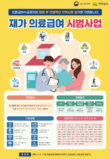 Àç°¡ ÀÇ·á±Þ¿© ½Ã¹ü»ç¾÷Àº Àå±â ÀÔ¿ø Çʿ伺ÀÌ ³·À½¿¡µµ ÇÑ ´Þ ÀÌ»ó ÀÔ¿ø ÁßÀÎ ÀÇ·á±Þ¿© ¼ö±ÞÀÚ¸¦ ´ë»óÀ¸·Î Åð¿ø ÈÄ Áý¿¡¼ ÀǷᡤµ¹º½¡¤½Ä»ç¡¤À̵¿ ¼ºñ½º µîÀ» ÅëÇÕ Á¦°øÇØ Áö¿ª»çȸ º¹±Í¡¤Á¤ÂøÀ» Áö¿øÇÏ´Â »ç¾÷ÀÌ´Ù.