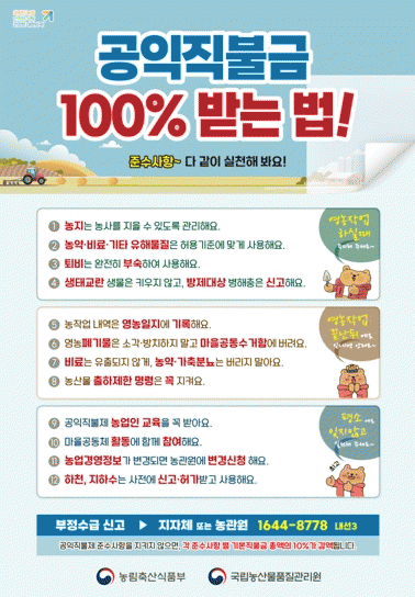 ÀÚ°Ý¿ä°Ç °ËÁõ°ú ÇöÀåÁ¡°Ë °á°ú Áö±Þ ´ë»ó ³óÁö¡¤³ó¾÷ÀÎ ¿ä°ÇÀ» ÃæÁ·ÇÏÁö ¸øÇϸé Áö±Þ ´ë»ó¿¡¼ Á¦¿ÜÇÑ´Ù. À̹ۿ¡ Áؼö»çÇ×À» ÀÌÇàÇÏÁö ¾ÊÀ¸¸é °øÀÍÁ÷ºÒ±Ý ÃѾ×ÀÇ 5% ¶Ç´Â 10%¸¦ °¨¾×ÇÑ´Ù. °°Àº Áؼö»çÇ×À» Áö³ÇØ¿¡ ÀÌ¾î ¿ÃÇØµµ ¹Ýº¹ÀûÀ¸·Î À§¹ÝÇÑ °æ¿ì ¿ÃÇØ °¨¾×·üÀ» 2¹è Àû¿ëÇÑ´Ù.