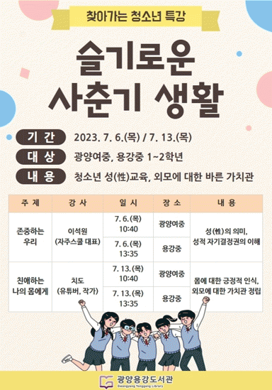 '½½±â·Î¿î »çÃá±â »ýȰ'Àº ±¤¾ç¿©ÀÚÁßÇб³, ±¤¾ç¿ë°ÁßÇб³ 1~2Çгâ ÇлýÀ» ´ë»óÀ¸·Î °¢ 2ȸ¾¿ ã¾Æ°¡´Â °ÀÇ·Î ÁøÇàµÈ´Ù.