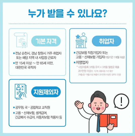 Áö¿ø ´ë»óÀº ¸¸ 15¼¼ ÀÌ»ó ¸¸ 65¼¼ ¹Ì¸¸ÀÇ ¼øÃµ½Ã¿¡ °ÅÁÖ ÁßÀÎ ±Ù·ÎÀÚ ¶Ç´Â ¼øÃµ½Ã ¼ÒÀç »ç¾÷Àå ±Ù·ÎÀÚ(ÁÖ¼ÒÁö ¹«°ü)À̸ç, ÀÚ¿µ¾÷ÀÚ, Ç÷§Æû ³ëµ¿ÀÚ, ¿¹¼úÀεµ ¼ö±ÞÀÌ °¡´ÉÇÏ´Ù. ¾÷¹«¿Í °ü·Ã ¾ø´Â Áúº´¡¤ºÎ»óÀ¸·Î ÀÎÇØ ¿¬¼Ó 3ÀÏ ÀÌ»ó(´ë±â±â°£ 3ÀÏ) ÀÔ¿øÇßÀ» ¶§ ÇÏ·ç¿¡ 46,180¿ø(ÃÖÀúÀÓ±ÝÀÇ 60%)À» Áö¿ø¹Þ´Â´Ù.