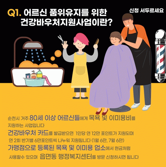 ¾î¸£½Å °Ç°¹Ù¿ìó »ç¾÷Àº ¼øÃµ½Ã°¡ Áö³ÇØ 1¿ùºÎÅÍ ¸¸ 80¼¼ ÀÌ»ó ¾î¸£½Å¿¡°Ô ¿ù 1¸¸ ¿ø, ¿¬°£ ÃÖ°í 12¸¸ ¿øÀÇ ¸ñ¿å ¹× ÀÌ¡¤¹Ì¿ë ºñ¿ëÀ» ¹Ù¿ìó Çü½ÄÀ¸·Î Áö¿øÇÏ´Â Á¦µµÀÌ¸ç ¹Ù¿ìó´Â °¡¸ÍÁ¡À¸·Î µî·ÏµÈ ¾÷¼Ò¿¡¼¸¸ »ç¿ëÇÒ ¼ö ÀÖ´Ù.