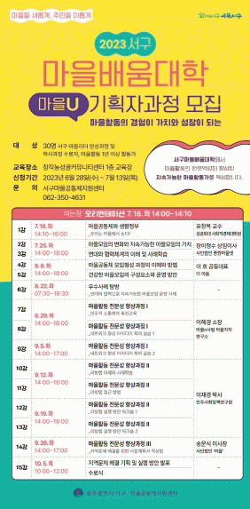 ƯÈ÷ À̹ø °úÁ¤¿¡´Â '¿ì¸° ¸¶À»¿¡¼ ³í´Ù'ÀÇ ÀúÀÚÀÎ À¯Ã¢º¹ ±³¼ö(¼º°øÈ¸´ë »çȸÀû°æÁ¦´ëÇпø)¸¦ ºñ·ÔÇÑ ºÐ¾ßº° ¸¶À»Àü¹®°¡µéÀÌ °Ç°ÇÑ ¸¶À»¸ðÀÓ ¿î¿µ, Áö¿ª¹®Á¦ ÇØ°áÀ» À§ÇÑ ½Çõ¹æ¾È ¿öÅ©¼ó µî¿¡ Âü¿©ÇØ ¸¶À»ÇöÀå¿¡¼ ÇÊ¿ä·Î Çϴ Ȱµ¿°¡µéÀ» ÁýÁß À°¼ºÇÒ ¿¹Á¤ÀÌ´Ù.