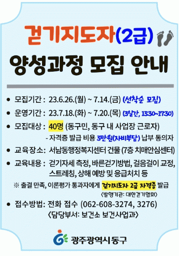 °úÁ¤ À̼öÀÚ´Â ´ëÇѰȱâÇùȸ¿¡¼ ¹ß±ÞÇÏ´Â °È±âÁöµµÀÚ 2±Þ ÀÚ°ÝÁõÀ» ÃëµæÇÒ ¼ö ÀÖ´Ù. Âü¿©¸¦ ¿øÇÏ´Â ÁÖ¹ÎÀº µ¿±¸º¸°Ç¼Ò º¸°Ç»ç¾÷°ú·Î ÀüÈ Á¢¼öÇÏ¸é µÈ´Ù. ±³À°ºñ´Â ¹«·á, ÀÚ°ÝÁõ ¹ß±Þ ºñ¿ë(3¸¸ ¿ø)Àº °³ÀÎ ºÎ´ãÀÌ´Ù.