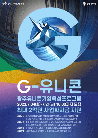 ¡®Ã¢¾÷¼º°ø·üÀÌ ³ôÀº ±âȸµµ½Ã ±¤ÁÖ¡¯ ½ÇÇöÀ» À§ÇØ Ã³À½ ½ÃÇàÇÏ´Â ¡®G-À¯´ÏÄÜ »ç¾÷¡¯Àº Áö¿ª ³» ¿ì¼öÇÑ ±â¼ú·Â°ú ¼ºÀå °¡´É¼ºÀÌ ³ôÀº â¾÷±â¾÷À» ¼±¹ß, ÃÖ´ë 2¾ï¿ø À̳» »ç¾÷ÈÀÚ±Ý »Ó¸¸ ¾Æ´Ï¶ó ÇØ¿Ü½ÃÀå ÁøÃâ, ÅõÀÚÀ¯Ä¡, ´ë±â¾÷ °³¹æÇüÇõ½ÅÀü·«(¿ÀÇÂÀ̳뺣À̼Ç) µî ´Ù¾çÇÑ À°¼ºÇÁ·Î±×·¥À» Áö¿øÇÑ´Ù.