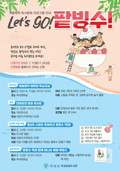 ¡®Let¡¯s GO! ÆÏºù¼ö-¹Ì¼Ç 5 ½ºÅÆÇÁ Åõ¾î'¶ó´Â µµ¼°ü ÀÌ¿ë üÇèµµ ÁøÇàµÈ´Ù. Âü°¡ÀÚµéÀº û±¸±âÈ£ Ã¥ ã±â, ±×¸²Ã¥ Àбâ, µµ¼°ü ÄûÁî Ç®±â µî °úÁ¦¸¦ ¼öÇàÇÏ¸ç µµ¼°ü¿¡ ´ëÇØ ¾Ë¾Æ°¥ ¼ö ÀÖ´Ù. ÀÌ °úÁ¤¿¡¼ ÆÏºù¼ö Àç·áµµ ȹµæÇÏ¸é¼ ÀڽŸ¸ÀÇ ÆÏºù¼ö¸¦ ¸¸µé¾î ¸ÔÀ» ¼ö ÀÖ´Ù.