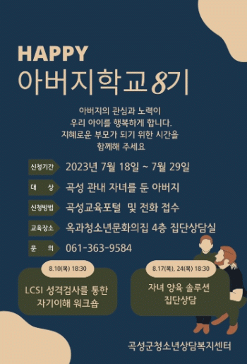 ¡®ÇູÇÑ ¾Æ¹öÁö Çб³¡¯´Â Áö¿ª ³» ÀÚ³àµé µÐ ¾Æ¹öÁö 20¸íÀ» ´ë»óÀ¸·Î ¿î¿µµÈ´Ù. °ÀÇ´Â ¿À´Â 8¿ù 10ÀϺÎÅÍ 24ÀϱîÁö ¸ÅÁÖ ¸ñ¿äÀÏ ¿ÀÈÄ 6½Ã 30ºÐ¿¡ °î¼º±ºÃ»¼Ò³â»ó´ãº¹Áö¼¾ÅÍ 4Ãþ Áý´Ü»ó´ã½Ç¿¡¼ ÁøÇàµÈ´Ù.
