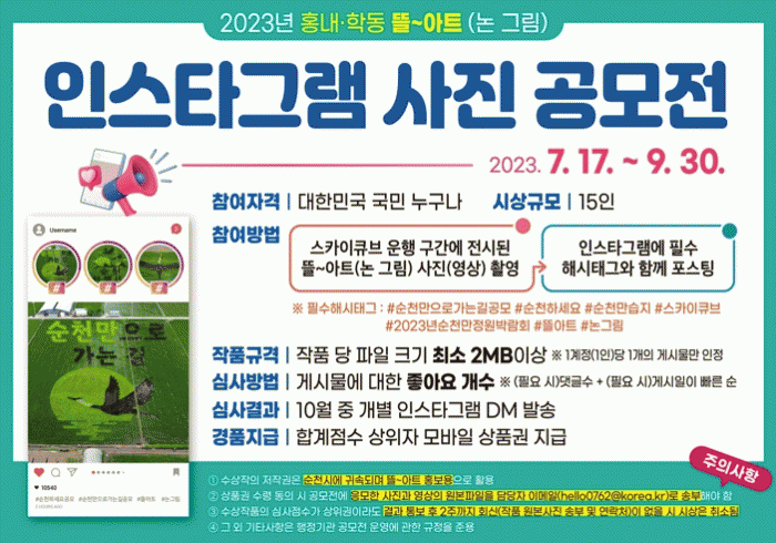 À̹ø »çÁø °ø¸ðÀü¿¡ ´ëÇÑ ÀÚ¼¼ÇÑ Á¤º¸¿Í ÀÀ¸ð ¹æ¹ýÀº ¼øÃµ½Ã °ø½Ä ÀνºÅ¸±×·¥°ú 2023¼øÃµ¸¸±¹Á¦Á¤¿ø¹Ú¶÷ȸ°¡ ¿¸®°í ÀÖ´Â ¼øÃµ¸¸±¹°¡Á¤¿ø ½ºÄ«ÀÌÅ¥ºê ž½Â¿ª¿¡¼ È®ÀÎÇÒ ¼ö ÀÖ´Ù.