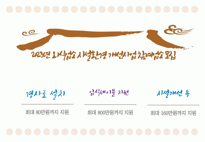 ½Ã´Â ¡ã³ëÀΰú Àå¾ÖÀÎ µîÀÇ ÀÌ¿ë ÆíÀǸ¦ À§ÇÑ ÁøÀÔ °æ»ç·Î ¼³Ä¡(ÃÖ´ë 80¸¸¿ø) ¡ãÁÂ½Ä ½ÄŹÀ» ÀÔ½Ä ½ÄŹÀ¸·Î ±³Ã¼(ÃÖ´ë 800¸¸¿ø) ¡ãÈÀå½Ç°ú ÁÖ¹æ ¹Ù´Ú µî ³ëÈÄ ½Ã¼³ÀÇ °³¼±(ÃÖ´ë 160¸¸¿ø)À» Èñ¸ÁÇÏ´Â ¿Ü½Ä ¾÷¼Ò¸¦ Áö¿øÇÒ °èȹÀÌ´Ù.