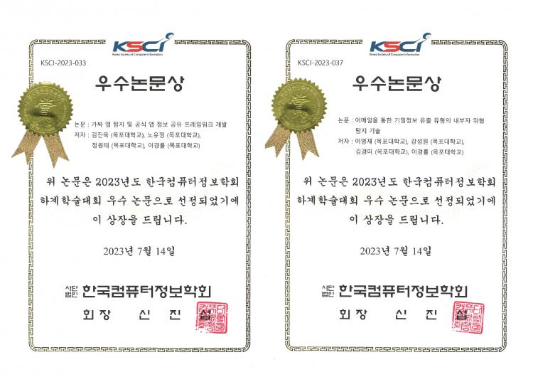 ¿ì¼ö³í¹®»óÀ» ¼ö»óÇÑ ¸ñÆ÷´ë Á¤º¸º¸È£Çаú °û½ÂÈñ, °í¼ö¿Ï, ÀÌÁرÇ, ÀÌÀçÇõ Çлý°ú Àü³²´ë ÀÚÀ²Àü°øÇкΠÀ±Áø¼ ÇлýÀº ¡ã¡®º¸¾È USB Áö¹® ÀÎÁõ Ãë¾àÁ¡ ºÐ¼® ¹× ½ÇÁõ: FÁ¦Ç°À» ±â¹ÝÀ¸·Î¡¯¶ó´Â ³í¹®À» ¹ßÇ¥ÇÏ¿´À¸¸ç, ¸ñÆ÷´ë Á¤º¸º¸È£Çаú È«¼¼ÁØ, °í¼ö¿Ï ÇлýÀº ¡ã¡®µå·Ð ȯ°æ¿¡¼ÀÇ GPS ½ºÇªÇÎ Ãë¾àÁ¡ ºÐ¼® ¹× ½ÇÁõ: GÁ¦Ç°À» ´ë»óÀ¸·Î¡¯, ¸ñÆ÷´ë Á¤º¸º¸È£Çаú ±èÁø¿í, ³ëÀ¯Á¤, Á¤¿øÅ ÇлýÀº ¡ã¡®°¡Â¥ ¾Û ŽÁö ¹× °ø½Ä ¾Û Á¤º¸ °øÀ¯ ÇÁ·¹ÀÓ¿öÅ© °³¹ß¡¯, ¸ñÆ÷´ë Á¤º¸º¸È£Çаú ÀÌ¿µÀç, °¼º¿ø, ±è°æ¹Ì ÇлýÀº ¡ã¡®À̸ÞÀÏÀ» ÅëÇÑ ±â¹ÐÁ¤º¸ À¯Ãâ À¯ÇüÀÇ ³»ºÎÀÚ À§Çù ŽÁö ±â¼ú¡¯ ³í¹®À¸·Î ÃÑ 4ÆíÀÇ ³í¹®À» ¹ßÇ¥ÇØ 4°³ÀÇ ¿ì¼ö³í¹®»óÀ» ¼ö»óÇÏ¿´´Ù.
